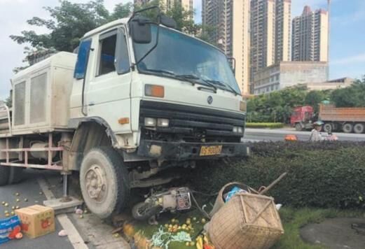 在泵車前的綠化帶上,散落著兩個大竹筐,筐內裝著水果,路面遺落一雙拖鞋、一個破碎的安全頭盔及眾多摩托車零部件。