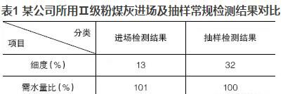 優(yōu)質(zhì)的粉煤灰摻入混凝土可明顯地改善混凝土的和易性,當粉煤灰摻量大于膠材總量的5%~10%時,效果極為明顯?,F(xiàn)今在混凝土實際生產(chǎn)中,粉煤灰摻量往往達到20%,有的甚至高達30%,但混凝土的和易性卻不盡人意。抽取原材料進行檢測時,發(fā)現(xiàn)粉煤灰的檢測結(jié)果經(jīng)常不滿足標準要求或者與驗收時的結(jié)果相差甚遠。現(xiàn)以某公司所用Ⅱ級粉煤灰進場及抽樣常規(guī)檢測結(jié)果進行對比,見表1。