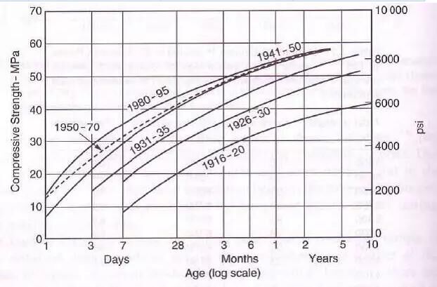 現(xiàn)在水泥與100年前水泥不相同大了去了?,F(xiàn)有很多高強水泥可采用高C3S、低C2S,高細度的方式實現(xiàn)早期高強目標。盡管使用“高強水泥”可以降低規(guī)定強度的水泥用量、加快拆模、加速工程進度而使建設(shè)總承包方獲取豐厚利益,但是高水膠比和低水泥用量容易導致混凝土的滲透性較高,一般耐久性較差。過高早期強度和過早放棄模板的有效養(yǎng)護同樣對工程質(zhì)量產(chǎn)生安全隱患。