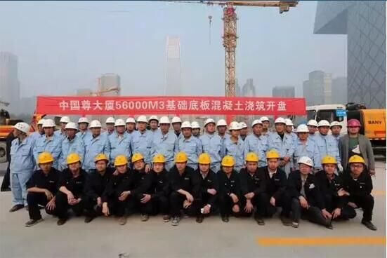 為了保障此次澆筑的順利完成,三一派出了20多名服務(wù)工程師駐守工地,保證每臺設(shè)備至少有一名服務(wù)工程師進(jìn)行專職服務(wù)。2014年4月27日,在18臺三一車載泵、20多臺三一攪拌車的全力保障下,“中國尊”項(xiàng)目完成了最大底板澆筑,將標(biāo)號60以上的高粘稠度混凝土一次性泵送到位。這次澆筑持續(xù)了96個小時,一次性連續(xù)澆筑混凝土總量達(dá)5.6萬立方米,在連續(xù)澆筑期間,實(shí)現(xiàn)了零事故、零投訴,澆筑一次成優(yōu),創(chuàng)造了北京建筑業(yè)的新奇跡。