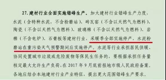 水泥等行業(yè)承擔(dān)居民供暖、協(xié)同處置城市垃圾或危險廢物等保民生任務(wù)的,要根據(jù)承擔(dān)任務(wù)量核定最大允許生產(chǎn)負荷,在2017年9月底前報地市級人民政府備案。各地應(yīng)結(jié)合本地建材行業(yè)產(chǎn)業(yè)特征,提出更大范圍錯峰生產(chǎn)要求。
