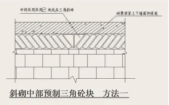 6)砌體頂部斜頂磚要求:砌到接近上層梁、板底約200mm,浮磚壓頂待下部砌體沉縮。在抹灰前(間 隔時間不少于14天),宜用實心磚斜砌擠緊,磚傾斜度為60度左右,砂漿應(yīng)飽滿,如圖所示: