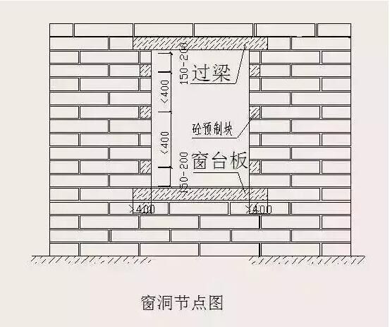 當(dāng)外墻為砌體時,須在外門窗洞兩側(cè)預(yù)埋C20混凝土塊(有混凝土企口情況除外),以便固定窗框(或副框)?;炷翂K寬度同墻厚,高度應(yīng)與砌塊同高或砌塊高度的1/2且不小于100mm,長度不小于200mm,最上部(或最下部)的混凝土塊中心距洞口上下邊的距離為150~200mm,其余部位的中心距不大于400mm,且均勻分布。嚴(yán)禁采用預(yù)埋木磚固定門窗。