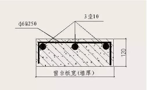 對于砌體墻,外窗洞下口必須澆筑寬與墻厚相同、高度不小于120mm、長度每邊伸入墻內(nèi)不少于400mm(不足400mm時通長設(shè)置)的混凝土窗臺板(針對窗臺下砌體八字縫措施),已設(shè)鋼筋混凝土凸窗套或窗臺板者除外。窗臺板為C20混凝土,內(nèi)配3Φ10主筋和φ6@250U型分布筋。