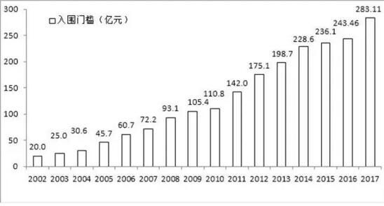 中國(guó)企業(yè)500強(qiáng)的入圍門(mén)檻及增幅(2002-2017)