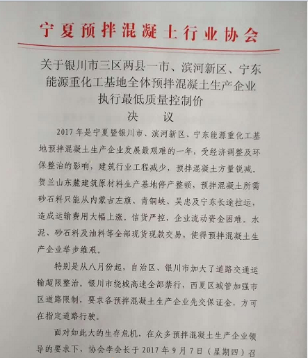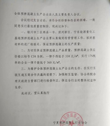 面對如此大的生存危機(jī),寧夏混凝土協(xié)會于9月7日召開了銀川市三區(qū)兩縣一市、濱河新區(qū)、寧東能源重化工基地全體預(yù)拌混凝土生產(chǎn)企業(yè)法人及主要負(fù)責(zé)人會議。會議一致同意實(shí)行最低質(zhì)量控制價。預(yù)拌混凝土供應(yīng)價格以標(biāo)號C30為例,一律不得低于330元/方,實(shí)行17%稅率的企業(yè)一律不能低于360元/方,以切實(shí)保證當(dāng)?shù)仡A(yù)拌混凝土質(zhì)量。