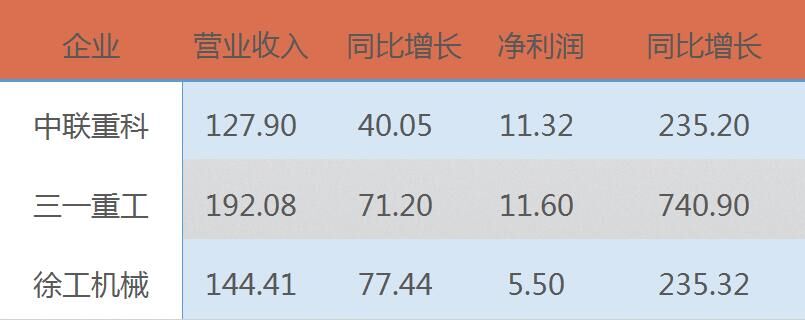 混凝土機(jī)械市場復(fù)蘇程度決定未來生產(chǎn)企業(yè)利潤回復(fù)的彈性高度,混凝土機(jī)械的回暖,有利改善行業(yè)企業(yè)毛利率水平。中聯(lián)重科、三一重工、徐州股份三家上市公司上半年年報(bào)數(shù)據(jù)喜人。