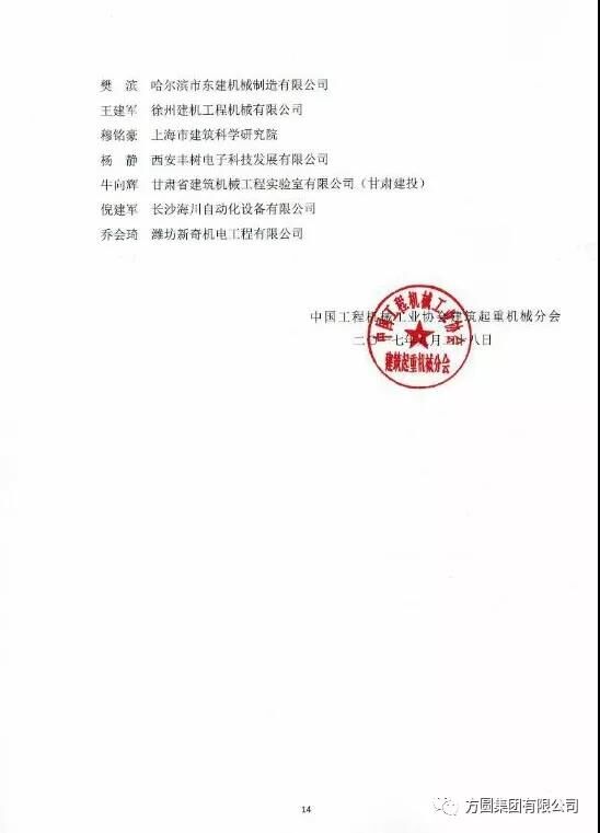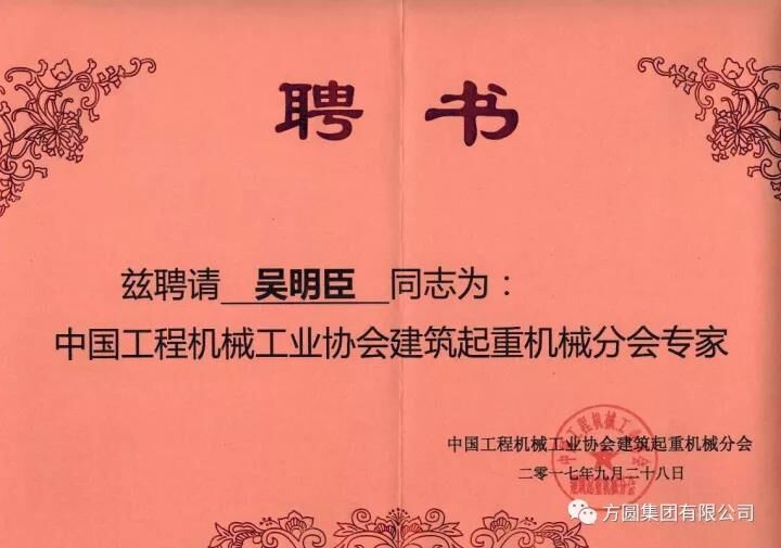 在11月9日召開的中國工程機械工業(yè)協(xié)會建筑起重機械分會年會上,以中工機協(xié)【2017】建起字11號文件公布了《關(guān)于建筑起重機械行業(yè)首批18名專家的聘用決定》,聘用首批18名專家為建筑起重機械行業(yè)專家,方圓集團副總工程師吳明臣名列其中。