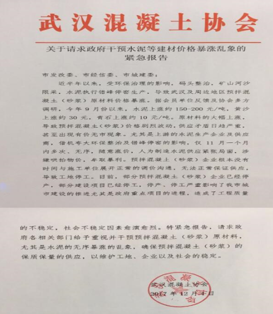 武漢混凝土協(xié)會網(wǎng)站4日發(fā)布《關于請求政府干預水泥等建材價格暴漲亂象的緊急報告》,《報告》表示,上游的水泥生產(chǎn)企業(yè)及供應商借機夸大環(huán)保整治及錯峰停窯的影響,僅11月有一個月內(nèi)多次、無序,隨意漲價,人為制造水泥供應緊張局面,涉嫌哄抬物價,牟取暴利。因為價格原因無法正常保證混凝土(砂漿)的正常供應,部分建設項目已經(jīng)停工。
