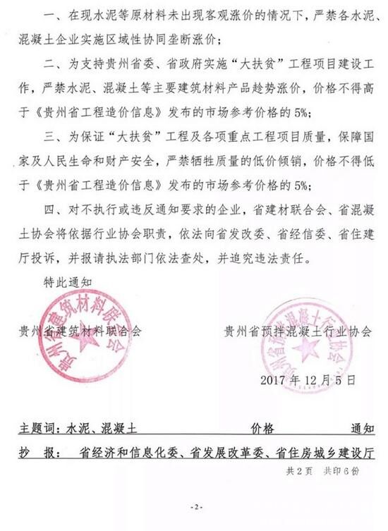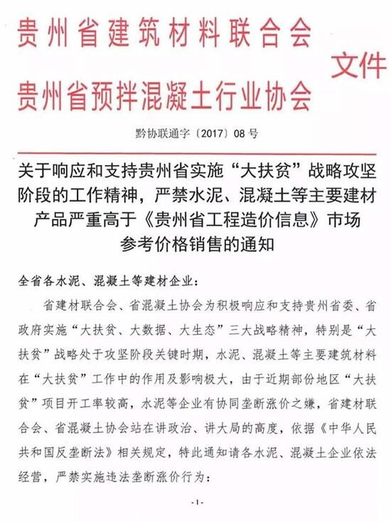 12月5日,貴州省建筑材料聯(lián)合會和貴州省預拌混凝土行業(yè)協(xié)會聯(lián)合發(fā)文《關于響應和支持貴州省實施“大扶貧”戰(zhàn)略攻堅階段的工作精神,嚴禁水泥、混凝土等主要建材產(chǎn)品嚴重高于<貴州省工程造價信息>市場參考價格銷售的通知》(黔協(xié)聯(lián)通字〔2017〕08號)(下文稱為《通知》)。