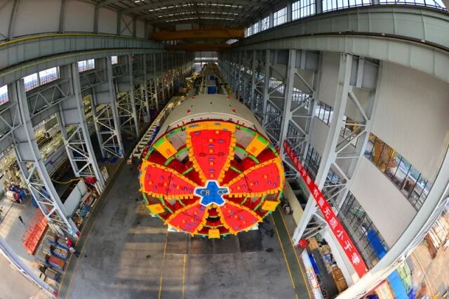 ▲鐵建重工自主研制的國(guó)產(chǎn)首臺(tái)常壓換刀式超大直徑泥水平衡盾構(gòu)機(jī)