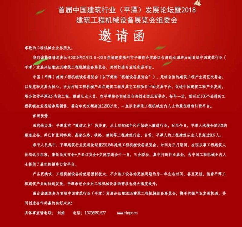 2018年2月21日-23日在福建省福州市平潭綜合實(shí)驗(yàn)區(qū)臺灣創(chuàng)業(yè)園舉辦的首屆中國建筑行業(yè)(平潭)發(fā)展論壇暨2018建筑工程機(jī)械設(shè)備展覽會,共同打造專業(yè)性交易平臺。