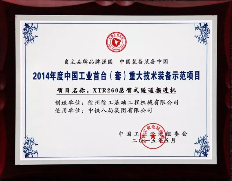 2014年6月,國內首臺懸臂式隧道掘進機徐工XTR260研制成功,在大連等地進行隧道施工,有效提升了隧道施工質量和效益,促進國內隧道施工模式的轉變,填補國內懸臂式隧道掘進機的空白;經中國機械工業(yè)聯(lián)合會組織鑒定,其主要技術性能達到國際領先水平,該設備獲得江蘇省首臺套重大裝備認定和資金支持,為2014年度中國工業(yè)首臺(套)重大技術裝備示范項目。