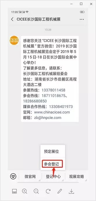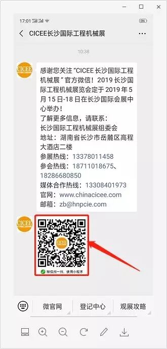 第1步,掃碼關(guān)注“CICEE長沙國際工程機械展”微信公眾號,點擊“參會登記”,獲取小程序二維碼。