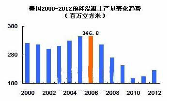 美國2000-2012年預(yù)拌混凝土產(chǎn)量變化趨勢(shì)(百萬立方米)