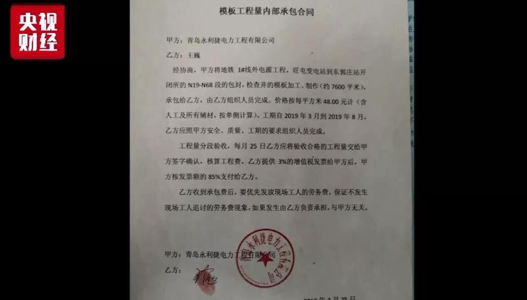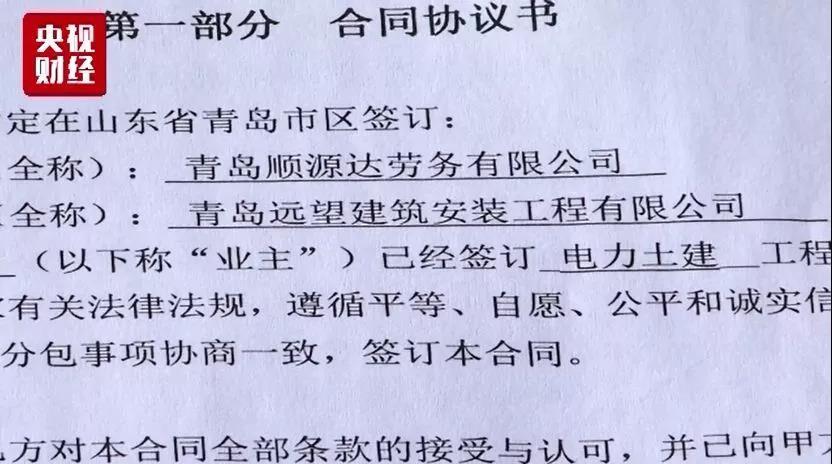 劉飛云介紹,該標段總承包方為中國葛洲壩集團電力有限責任公司,總承包方通過青島永利捷電力工程有限公司、青島順源達勞務(wù)有限公司等層層分包,最終由他所在的青島遠望建筑安裝工程有限公司實際施工。