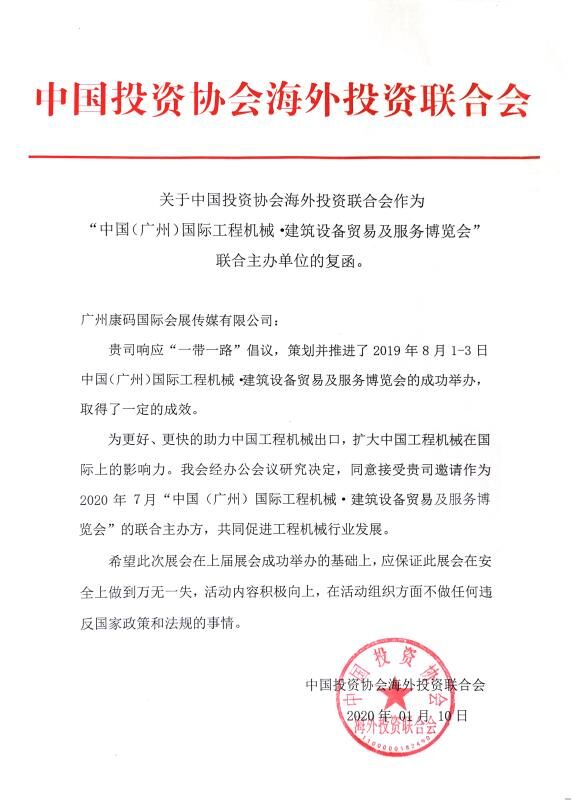 2019年開展的致力于促進“工程機械、建筑設(shè)備國際貿(mào)易與服務(wù)”的康馬展的成功舉行后,展會承辦方康馬網(wǎng)董事長劉智向中國投資協(xié)會海外投資聯(lián)合會(簡稱海合會)劉雄英會長匯報展會工作,會長對展會發(fā)展給予了充分肯定的同時欣然接受康馬申請,同意作為2020年康馬展聯(lián)合主辦方,給康馬展注入更多海外資源、開拓展會各方渠道,相信在海合會聯(lián)合主辦指導(dǎo)下,2020康馬展將打造成具備國際影響力的工程建筑機械國際貿(mào)易標桿展會。