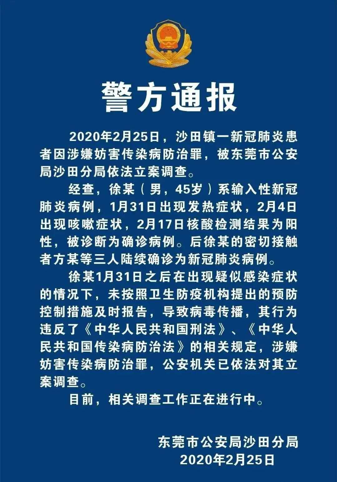 2月25日,東莞市公安局沙田分局發(fā)布《警方通報(bào)》,該工地徐某涉嫌妨害傳染病防治罪,被東莞市公安局沙田分局依法立案調(diào)查。