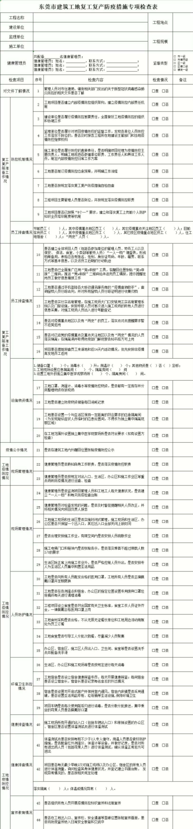 東莞市建筑工地復(fù)工復(fù)產(chǎn)防疫措施專項(xiàng)檢查表