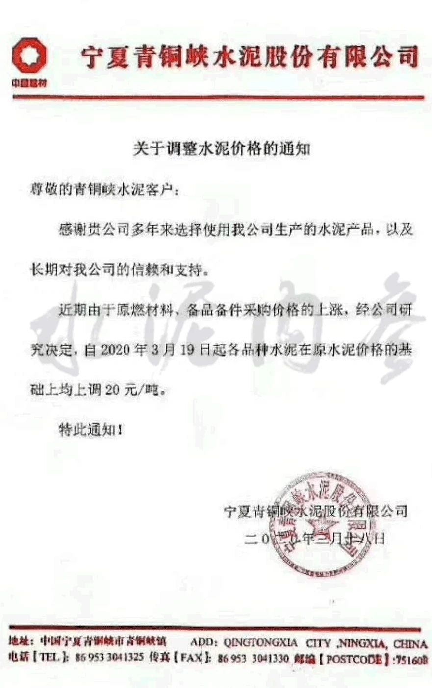 據(jù)消息:寧夏青銅峽水泥有限公司發(fā)布通知,稱由于近期原燃材料、備品備件采購價格上漲,公司決定自3月19日起各品牌、各品種水泥在原有價格基礎上上調(diào)20元/噸。