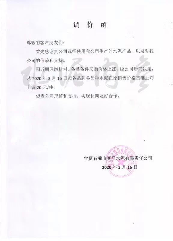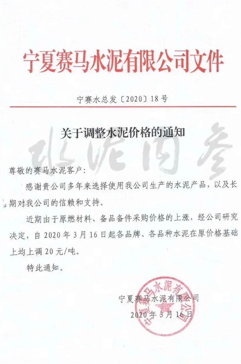 此前,寧夏賽馬水泥有限公司發(fā)布通知,稱由于近期原燃料、備品備件采購價格上漲,公司決定自3月16日起各品牌、各品種水泥在原有價格基礎上上調(diào)20元/噸。