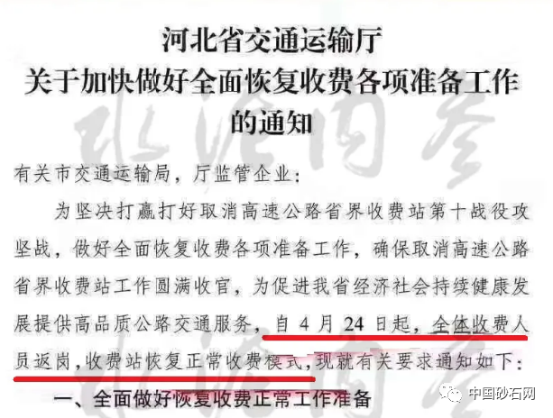今天起,隨著河北地區(qū)開始征收高速過路費,預(yù)計全國收費站也將陸續(xù)恢復(fù)正常收費模式,此前各省已經(jīng)陸續(xù)進(jìn)行了相關(guān)測試收費工作!預(yù)計,未來砂石運輸成本將大幅上漲!