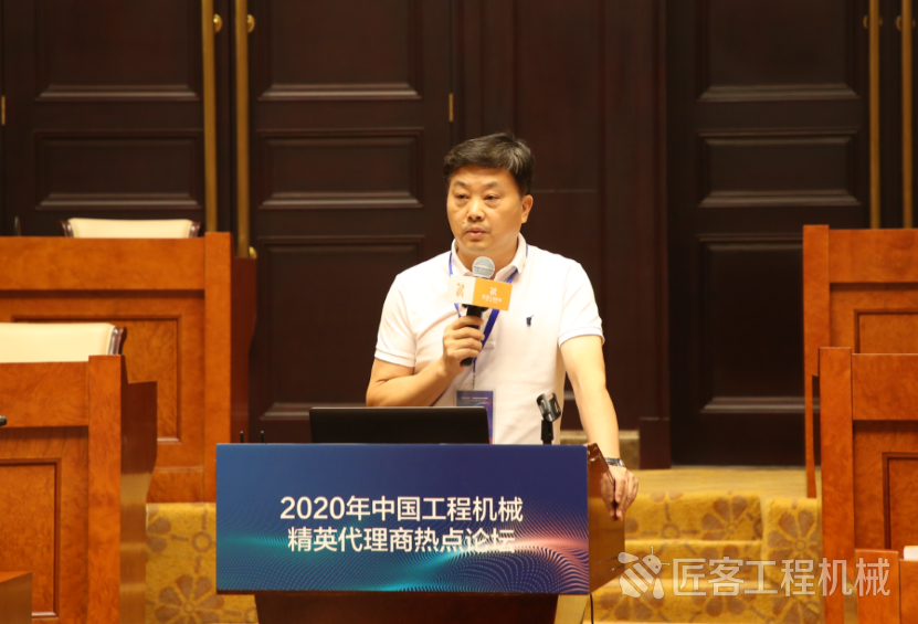 中國(guó)工程機(jī)械工業(yè)協(xié)會(huì)代理商工作委員會(huì)秘書(shū)長(zhǎng)、匠客工程機(jī)械傳媒總經(jīng)理?xiàng)钪痉贾鞒稚衔绲臅?huì)議并發(fā)言