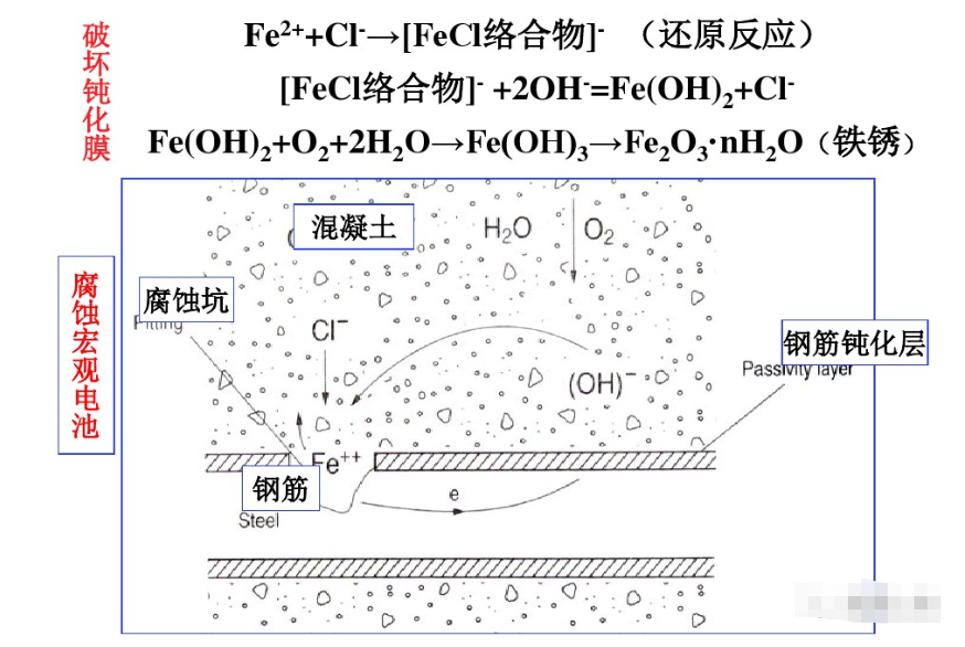 沿海地區(qū)主要的腐蝕因素就是硫酸鹽、氯離子、鎂離子等,對有堿活性骨料,還要考慮加鉀離子和鈉離子。其中,讓大家最關(guān)注的就是氯離子對鋼筋的銹蝕作用。