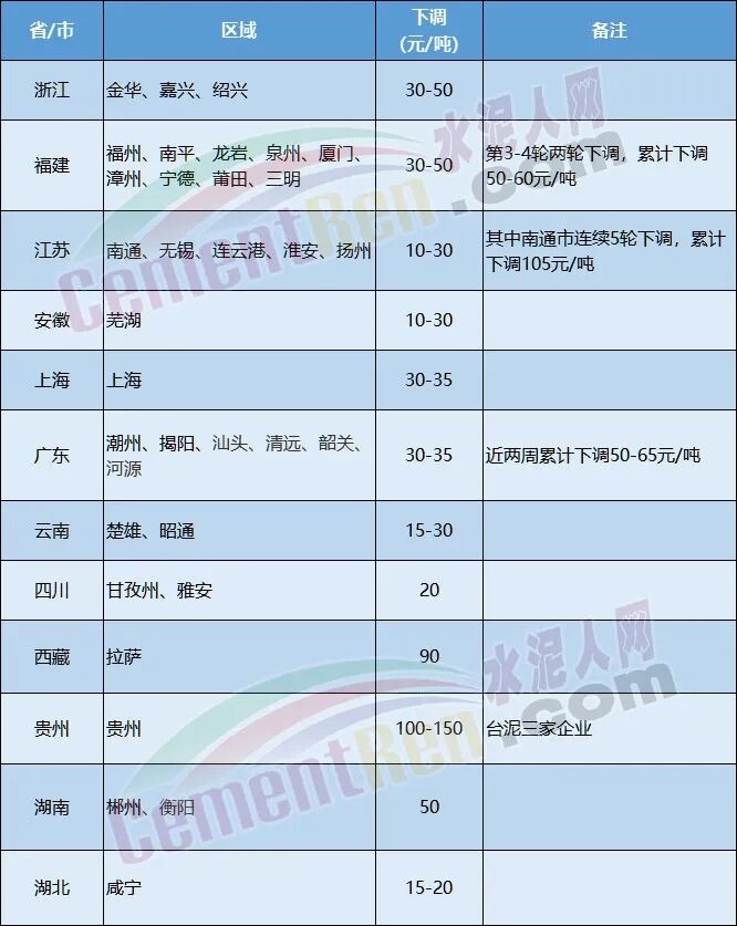 福建省福州、南平、龍巖、泉州等多地下調(diào)30-50元/噸
