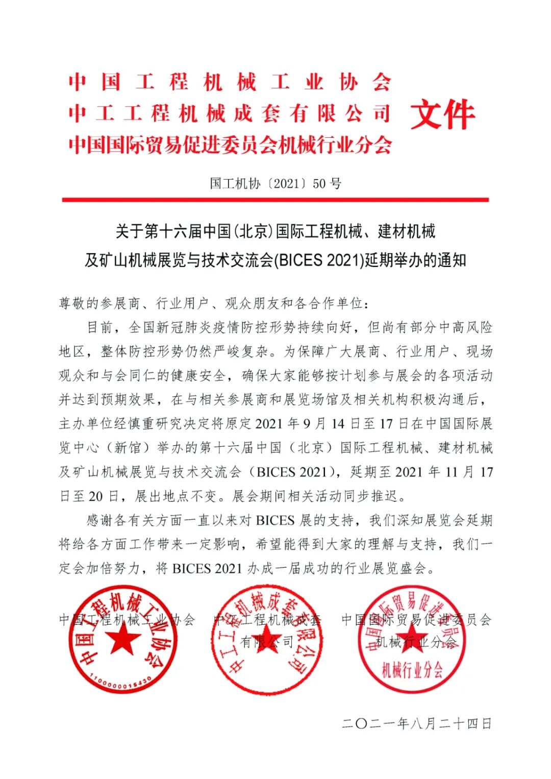 關(guān)于第十六屆北京工程機(jī)械展BICES 2021延期舉辦的通知