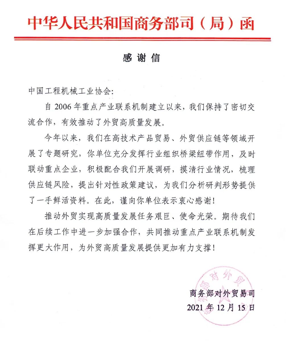 近日,商務(wù)部對外貿(mào)易司致函中國工程機械工業(yè)協(xié)會,就協(xié)會今年以來,積極配合商務(wù)部對外貿(mào)易司在高技術(shù)產(chǎn)品貿(mào)易、外貿(mào)供應(yīng)鏈等領(lǐng)域開展了專題研究,收集、整理了大量的行業(yè)外貿(mào)進出口情況,受到了高度的肯定。并指出,協(xié)會充分發(fā)揮行業(yè)組織橋梁紐帶作用,及時聯(lián)動重點企業(yè),積極配合商務(wù)部對外貿(mào)易司開展調(diào)研,摸清行業(yè)情況,梳理供應(yīng)鏈風險,提出針對性政策建議,為商務(wù)部對外貿(mào)易司分析研判形勢提供了一手鮮活資料。在此,謹向協(xié)會表示衷心感謝!