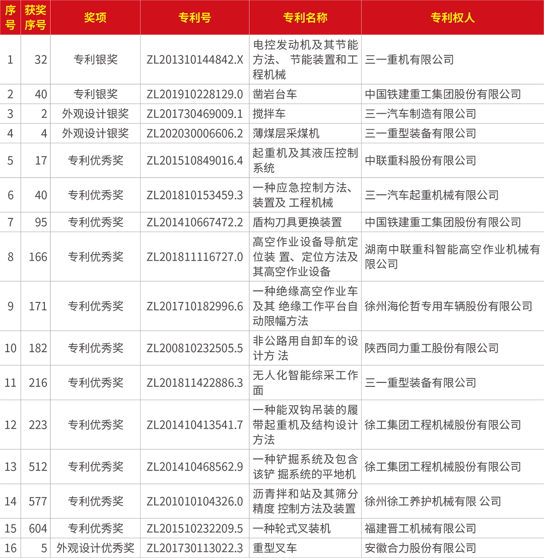 本屆評(píng)選活動(dòng)中,中國(guó)工程機(jī)械行業(yè)共有十六項(xiàng)專(zhuān)利榮獲“中國(guó)專(zhuān)利獎(jiǎng)”,其中兩項(xiàng)獲專(zhuān)利銀獎(jiǎng),兩項(xiàng)獲外觀(guān)設(shè)計(jì)銀獎(jiǎng),十一項(xiàng)獲專(zhuān)利優(yōu)秀獎(jiǎng),一項(xiàng)獲外觀(guān)設(shè)計(jì)優(yōu)秀獎(jiǎng)。