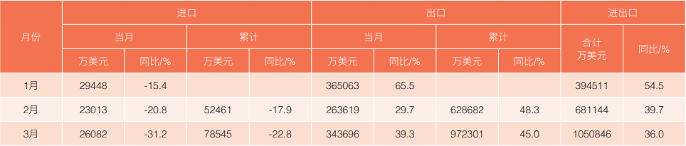 2022年3月進(jìn)口額2.61億美元,同比下降31.2%;出口額34.37億美元,同比增長39.3%。進(jìn)口方面,2021年1-3月,零部件進(jìn)口4.89億美元,同比下降18.3%;占進(jìn)口總額的62.3%,進(jìn)口整機(jī)2.97億美元,同比下降29.3%,占進(jìn)口總額的37.7%。在進(jìn)口主要產(chǎn)品中,履帶挖掘機(jī)進(jìn)口數(shù)量下降76.6%,進(jìn)口金額下降69.9%,進(jìn)口額減少0.89億美元;零部件進(jìn)口額增加1.1億美元。進(jìn)口額下降主要產(chǎn)品有:履帶挖掘機(jī)、其他工程車輛、履帶式起重機(jī)、大馬力推土機(jī)等。進(jìn)口額增長的主要產(chǎn)品有:打樁機(jī)及工程鉆機(jī)、鑿巖機(jī)械和風(fēng)動工具、隧道掘進(jìn)機(jī)、混凝土攪拌機(jī)械等。