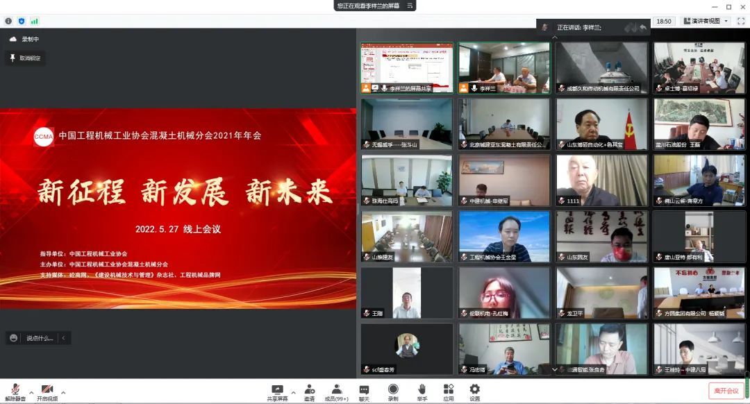 2022年5月27日,以“新征程 新發(fā)展 新未來 ”為主題的中國工程機械工業(yè)協(xié)會混凝土機械分會年會在線上隆重召開。中國工程機械工業(yè)協(xié)會會長蘇子孟、名譽會長祁俊、協(xié)會顧問龍國鍵、副秘書長呂瑩、副秘書長王金星、副秘書長尹曉荔、其他分支機構(gòu)領(lǐng)導(dǎo)、混凝土機械分會會長符忠軒、名譽會長盛春芳、秘書長李祥蘭、顧問易君、分會秘書處、分會理事及會員單位相關(guān)負(fù)責(zé)人、行業(yè)上下游企業(yè)與行業(yè)專家等在內(nèi)的兩百余人參與此次會議。