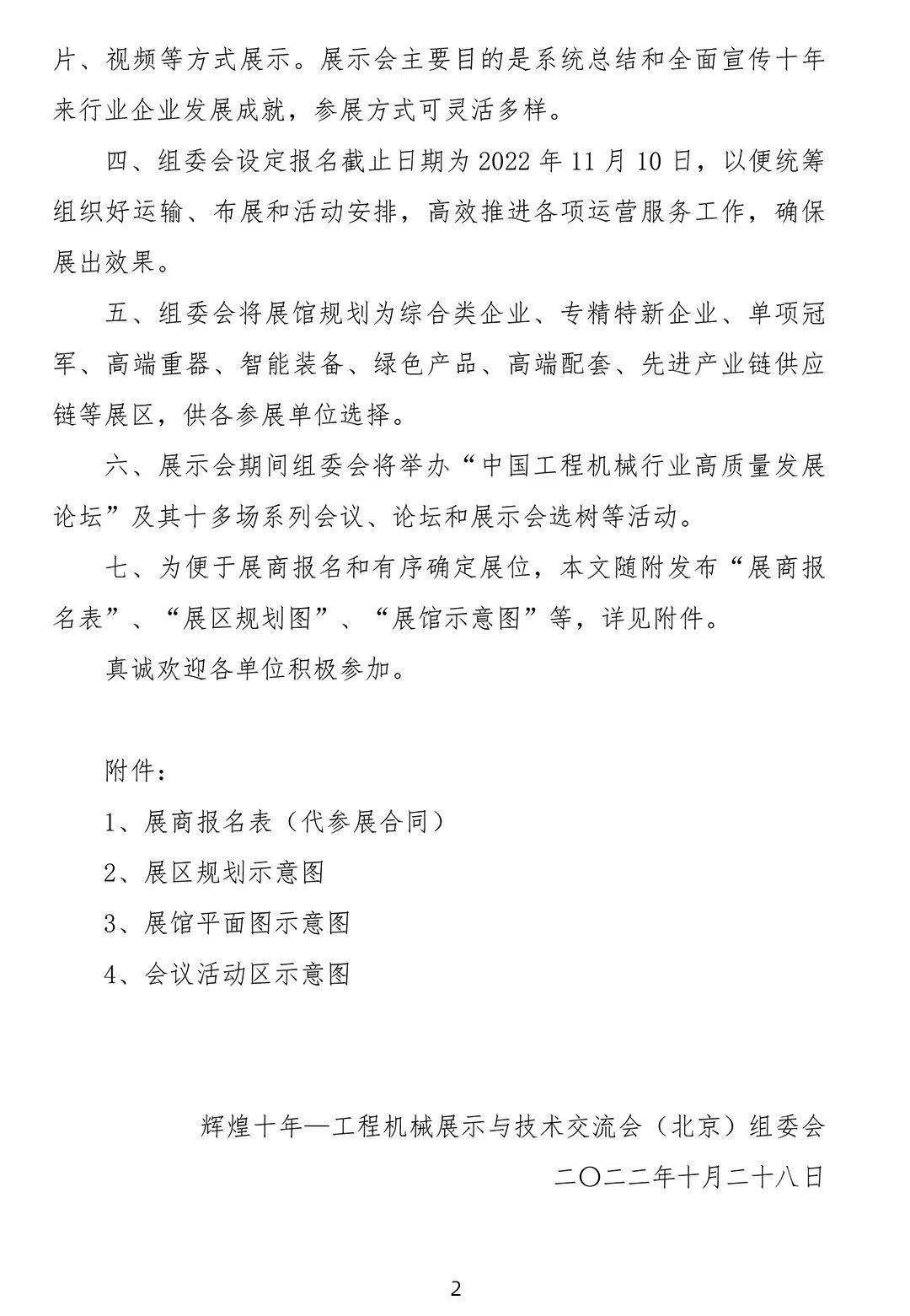 自協(xié)會發(fā)布舉辦“輝煌十年——工程機械展示與技術(shù)交流會(北京)”(以下簡稱“展示會”)通知后,得到了各參展單位的快速響應(yīng)和積極支持,有的已經(jīng)報名大面積參展,有的正在履行審批程序或來電表示參加展出,組委會深表衷心感謝!為及時傳遞展會信息,服務(wù)好廣大展商,辦好本次展示會,現(xiàn)向廣大展商正式發(fā)出邀請,并將有關(guān)展示會方案說明如下:一、為充分展示黨的十八大以來工程機械行業(yè)各領(lǐng)域取得的發(fā)展成就,協(xié)會研究決定召開本次展示會,邀請廣大協(xié)會會員和產(chǎn)業(yè)鏈上下游企業(yè)參展,共同分享企業(yè)發(fā)展成就和謀劃行業(yè)美好未來。二、展示會于2022年12月1日至3日在北京冬奧會滑雪大跳臺項目舉辦地——北京首鋼會展中心舉辦。屆時協(xié)會將邀請政府部門、相關(guān)用戶、媒體朋友和廣大觀眾到展示會現(xiàn)場參觀交流。12月3日(周六)實施社會公眾開放日,讓社會觀眾充分體驗工程機械發(fā)展魅力。三、北京首鋼會展中心適合舉辦室內(nèi)高品質(zhì)展示會,室外面積有限,而且適合承重較輕的產(chǎn)品展出。組委會初步規(guī)劃總展出面積2萬平米左右,希望各參展企業(yè)提供產(chǎn)業(yè)鏈上下游的先進(jìn)技術(shù)產(chǎn)品和高端裝備進(jìn)行展出,大型設(shè)備和示范工程應(yīng)用等可通過模型、圖片、視頻等方式展示。展示會主要目的是系統(tǒng)總結(jié)和全面宣傳十年來行業(yè)企業(yè)發(fā)展成就,參展方式可靈活多樣。四、組委會設(shè)定報名截止日期為2022年11月10日,以便統(tǒng)籌組織好運輸、布展和活動安排,高效推進(jìn)各項運營服務(wù)工作,確保展出效果。五、組委會將展館規(guī)劃為綜合類企業(yè)、專精特新企業(yè)、單項冠軍、高端重器、智能裝備、綠色產(chǎn)品、高端配套、先進(jìn)產(chǎn)業(yè)鏈供應(yīng)鏈等展區(qū),供各參展單位選擇。六、展示會期間組委會將舉辦“中國工程機械行業(yè)高質(zhì)量發(fā)展論壇”及其十多場系列會議、論壇和展示會選樹等活動。七、為便于展商報名和有序確定展位,本文隨附發(fā)布“展商報名表”、“展區(qū)規(guī)劃圖”、“展館示意圖”等,詳見附件。