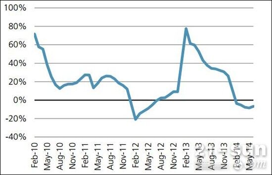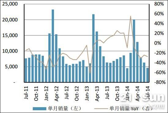 瑞銀表示,行業(yè)整體景氣度并未好轉(zhuǎn),下滑之勢(shì)未改。2013年4月開(kāi)始,土方機(jī)械單月銷(xiāo)量增速由負(fù)轉(zhuǎn)正,其中挖機(jī)銷(xiāo)量在2013年四季度實(shí)現(xiàn)了超過(guò)20%的增長(zhǎng),裝載機(jī)在8月后亦實(shí)現(xiàn)了超過(guò)15%的月均銷(xiāo)量增長(zhǎng)。但進(jìn)入2014年以來(lái),由于房地產(chǎn)銷(xiāo)售及新開(kāi)工不佳,2014年3月,挖掘機(jī)和裝載機(jī)銷(xiāo)量分別下滑8%和4%,結(jié)束了11個(gè)月的正增長(zhǎng)。此后4-7月,跌幅持續(xù)擴(kuò)大,其中7月挖機(jī)銷(xiāo)量下降27%,裝載機(jī)銷(xiāo)量下滑20%。