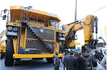 徐工在bauma2014上展出XDE240大型電傳動礦用自卸車,該車載重量230t,額定功率2500hp,發(fā)動機配置MTU16v4000,發(fā)電機采用GE GTA-41,牽引電機采用GE B25,輪邊減速比為31.8:1,采用交—直—交電傳動技術