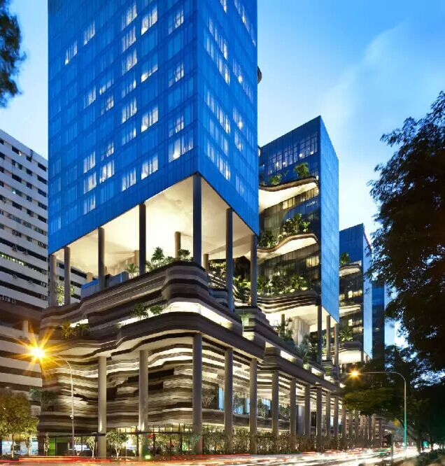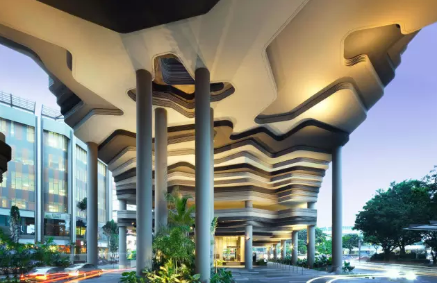 酒店位于其中心商業(yè)區(qū),是新加坡WOHA建筑事務(wù)所的杰作,負責景觀設(shè)計的為Tierra事務(wù)所。皮克林賓樂雅采用花園酒店理念,貫徹節(jié)能,已獲新加坡綠色建築最高榮譽BCA綠色建築白金獎,因其為首間使用太陽能酒店,獲得太陽能先鋒獎。酒店樓高16層,12層高的塔樓坐落在5層高裙樓樓頂上,塔樓每隔三層懸挑一座空中花園。裙樓被波狀預(yù)制混凝土包圍,WOHA稱之為地形建筑、會呼吸的建筑。
