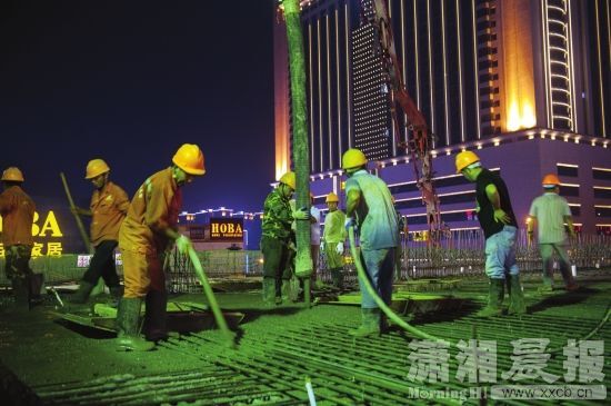 8月15日晚,長沙市萬家麗路與荷花路交會處附近,工人正給即將貫通的橋面澆筑混凝土。圖/瀟湘晨報記者 陳韻驕