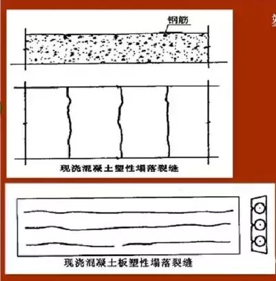 1塑性塌落裂縫塑性塌落裂縫,一般多發(fā)生在混凝土澆注過程或澆注成型后、混凝土初凝前發(fā)生,由于混凝土拌合物中的骨料在自重作用下緩慢下沉,水向上浮,即所謂的泌水,若是素混凝土,混凝土內部下沉是均勻的,若是鋼筋混凝土,則混凝土沿鋼筋下方繼續(xù)下沉,鋼筋上面的混凝土被鋼筋支頂,使混凝土沿鋼筋表面產生順筋裂縫。大流動性混凝土或水灰比較大的混凝土塑性塌落裂縫問題尤為嚴重。