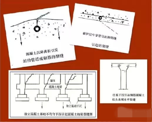 混凝土裂縫是由于混凝土結構由于內外因素的作用而產生的物理結構變化,包括塑性塌落裂縫、塑性收縮(干縮)裂縫、溫度裂縫等。
