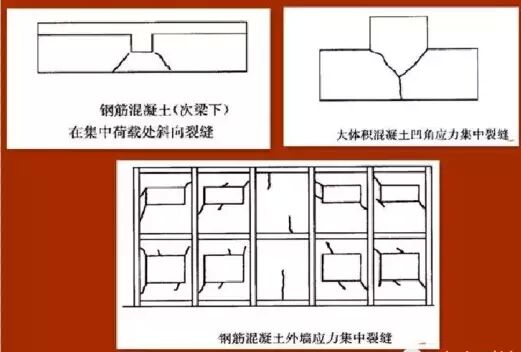 裂縫一般特征: 應力集中裂縫一般發(fā)生在門窗洞口的角部和平立面突出凹進的轉角處,且斜向楔形狀裂縫居多。在集中荷載較大的部位,易產生劈裂狀的裂縫。在預應力結構錨固端的局部承壓處,有時出現(xiàn)一條或數(shù)條裂縫,并呈放射形狀。