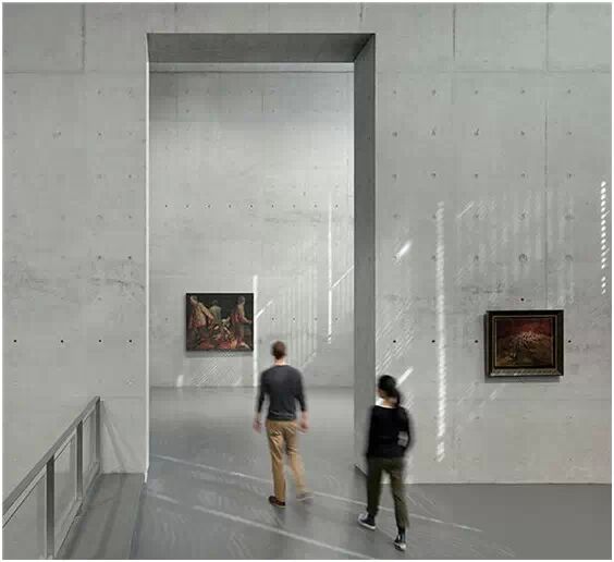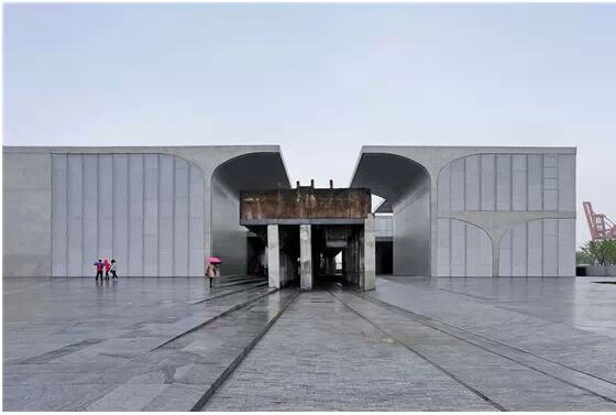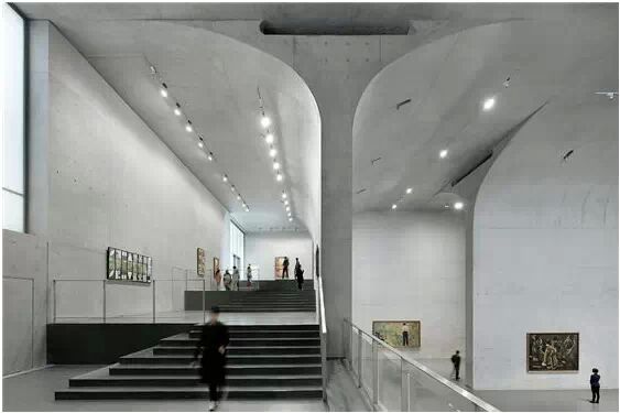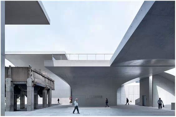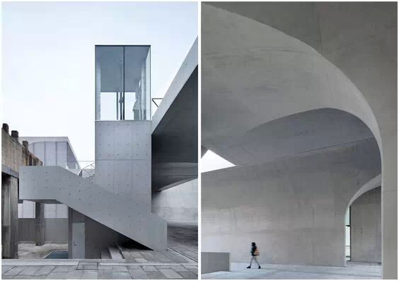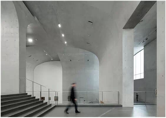 在“傘拱”結(jié)構(gòu)的空腔里,地面以上的“傘拱”覆蓋空間,墻體和天花均為清水混凝土的表面,它們的幾何分界位置也變得模糊。這樣的結(jié)構(gòu)性空間,在形態(tài)上不僅對(duì)人的身體形成庇護(hù)感,亦與保留的江邊碼頭的煤料斗產(chǎn)生視覺呼應(yīng)。建筑的內(nèi)部空間也得以呈現(xiàn)一種原始的野性魅力,而有著大小調(diào)節(jié)的空間尺度以及留有模板拼縫和螺栓孔的清水混凝土表面又會(huì)帶來一種現(xiàn)實(shí)感。這種“直白”式的結(jié)構(gòu)、材料、空間所形成的直接性與樸素性,加上大尺度出挑所產(chǎn)生的力量感或輕盈感,使整個(gè)建筑與原有場地的工業(yè)特質(zhì)間取得一種時(shí)間與空間的接續(xù)關(guān)系。地面以上的清水混凝土“傘拱”下的流動(dòng)展覽空間和地下一層傳統(tǒng)“白盒子”式的展覽空間由一個(gè)呈螺旋回轉(zhuǎn)、層層跌落的階梯空間聯(lián)接,既原始又現(xiàn)實(shí)的空間和古代、近代、現(xiàn)代直到當(dāng)代藝術(shù)的展覽陳列,這種并置的張力,呈現(xiàn)出一種具有時(shí)間性的展覽空間。