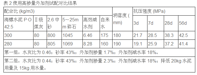 試配對比結(jié)果分析:試驗(yàn)用相同材料,提高外加劑摻量,降低水灰比及用水量,相同砂率,在相同坍落度下28d 及 56d強(qiáng)度相近并降低了成本