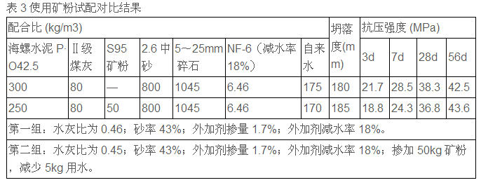 磨細(xì)礦粉能延緩膠凝材料的水化速度,延長凝結(jié)時間,尤其在炎熱的夏季及大體積混凝土應(yīng)用中有明顯效果。另外礦粉具有改善混凝土工作性,改善混凝土的內(nèi)部結(jié)構(gòu),提高抗?jié)B和抗腐蝕的能力,這些都有大量試驗(yàn)證明。因?yàn)樗嗯c礦粉存在部分差價,利用礦粉后期增強(qiáng)效果,既可以降低水化熱,減少裂縫的產(chǎn)生,又可以使混凝土后期強(qiáng)度不變或更高。如表3。