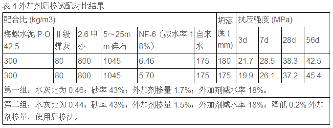 精確的計量是保證配合比準(zhǔn)確的前提,因此應(yīng)定期對攪拌機(jī)各配料秤進(jìn)行校稱,保證其精確度,使各材料用量在允許范圍之內(nèi),避免材料的浪費(fèi)。通過對設(shè)備的改造,使用后摻法分次加入外加劑。比如:先加入10% 的減水劑和 80% 的水,后加入 90% 的減水劑和 20% 的水。這樣就可以使水泥先進(jìn)行部分水化,避免了外加劑中的有效成分被迅速吸附,造成外加劑的浪費(fèi)。利用后摻分次加入外加劑可以降低部分外加劑的摻量,從而降低部分成本,并提高外加劑與水泥的適應(yīng)性,尤其在炎熱的夏季減少坍落度的損失。見表4。