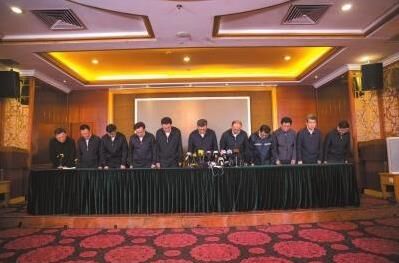 25日,深圳市委書記馬興瑞(左六)和市長許勤(左七)等深圳市和光明新區(qū)領(lǐng)導(dǎo)在發(fā)布會上鞠躬道歉。