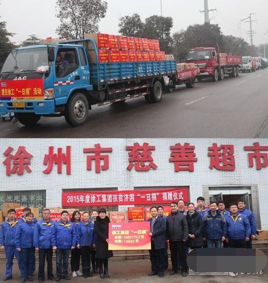 近日,八輛大卡車滿載著徐工全體員工的捐款和衣物,緩緩駛?cè)胄熘菔猩鐣头鲋行模腿バ旃こ袚?dān)的社會責(zé)任、徐工人的美德。2015年,在各單位的全力支持和全體員工暖暖愛心的捐助下,徐工集團(tuán)扶貧濟(jì)困“一日捐”活動共收到捐款1382175.5元、捐衣物13830件,連續(xù)14年捐款捐物全市第一。