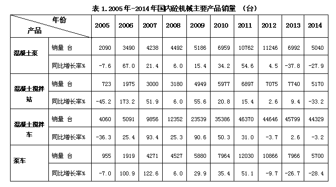 截止到2014年底,中國工程機械主要產(chǎn)品保有量約為650萬-704萬臺。其中,混凝土攪拌運輸車29.2萬-31.6萬臺,混凝土泵車5.9-6.3萬臺,混凝土泵6.3萬-6.8萬臺,混凝土攪拌站4.7萬-5.2萬臺。