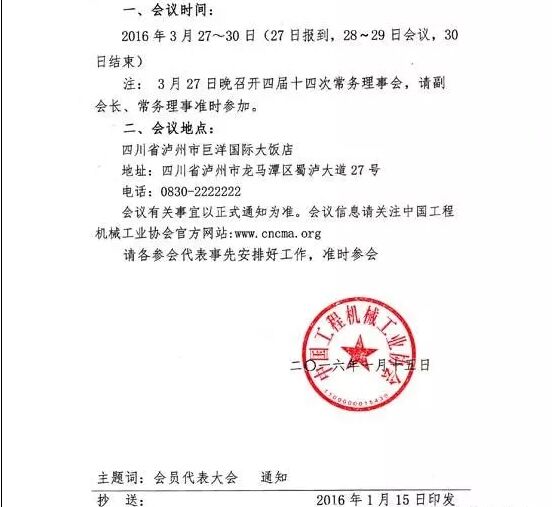 茲定于2016年3月27日~30日在四川瀘州召開“中國工程機械工業(yè)協(xié)會第五屆會員代表大會暨第十四屆工程機械發(fā)展高層論壇”。